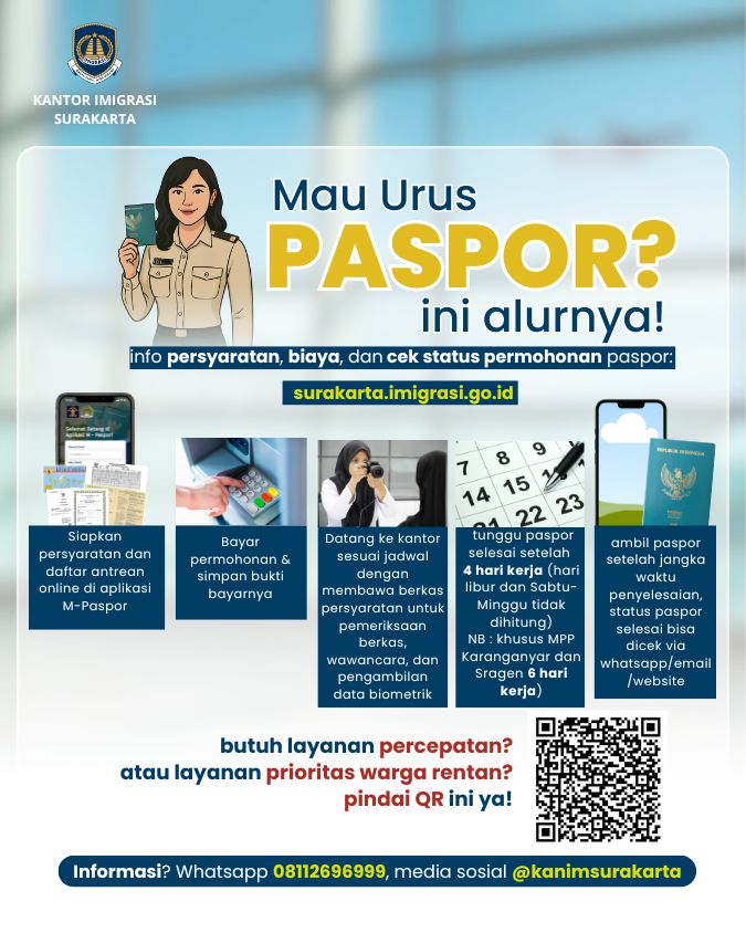Alur Permohonan Paspor RegulerFebruary 6, 2026/0 Comments/in Uncategorized/by Humas Kanim Surakarta https://surakarta.imigrasi.go.id/wp-content/uploads/2026/02/1.jpg 844 675 Humas Kanim Surakarta https://surakarta.imigrasi.go.id/wp-content/uploads/2025/08/Header-Logo-Kanim.png Humas Kanim Surakarta2026-02-06 11:52:192026-02-06 11:52:19Alur Permohonan Paspor Reguler