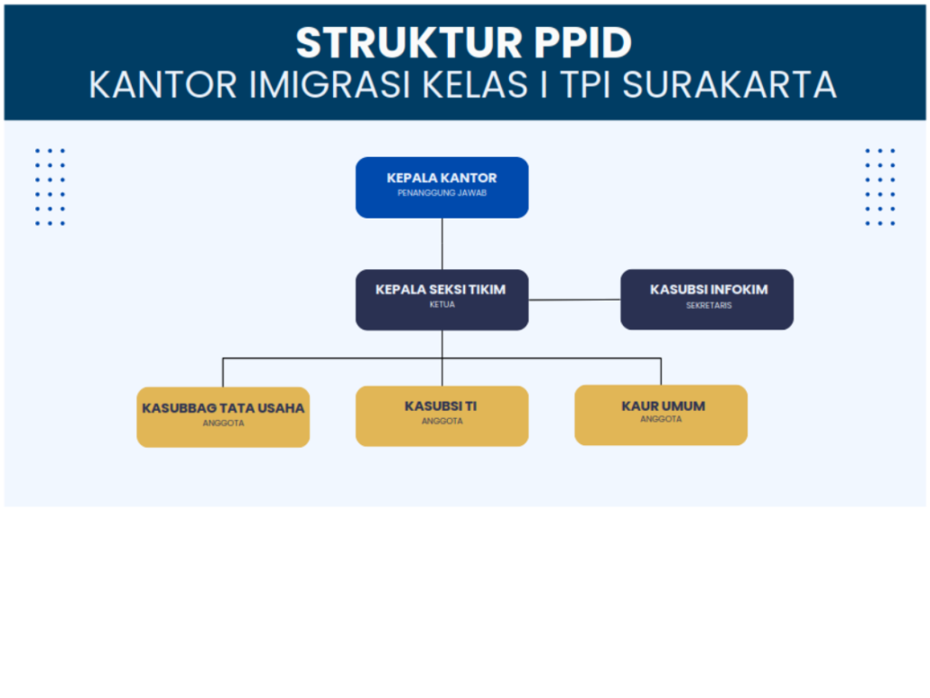 Tim Pejabat Penglola Informasi dan Dokumentasi (PPID) Kantor Imigrasi Kelas I TPI Surakarta dibentuk berdasarkan Keputusan Kepala Kantor Imigrasi Kelas I TPI Surakarta Nomor : WIM.13.IMI.IMI.2-02407.UM.02.02 Tahun 2025 yang ditetapkan pada tanggal 7 Maret 2025.