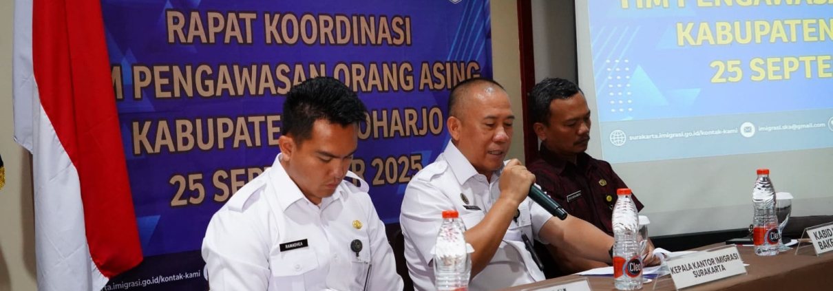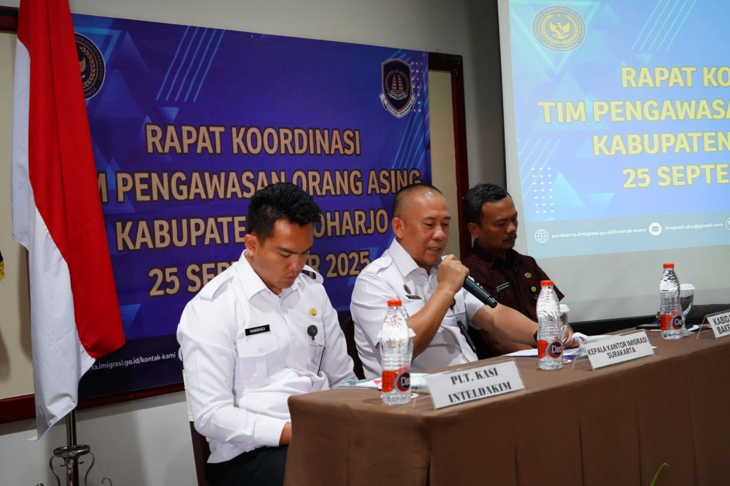 Sukoharjo, 25 September 2025 – Tim Pengawasan Orang Asing (TimPORA) Kabupaten Sukoharjo menggelar Rapat Koordinasi (Rakor) di Hotel Tosan Solo Baru pada Kamis (25/9). Kegiatan ini diinisiasi oleh Kantor Imigrasi Kelas I TPI Surakarta dan diikuti anggota TimPORA dari berbagai unsur, meliputi pemerintah daerah, TNI/Polri, serta lembaga vertikal terkait.